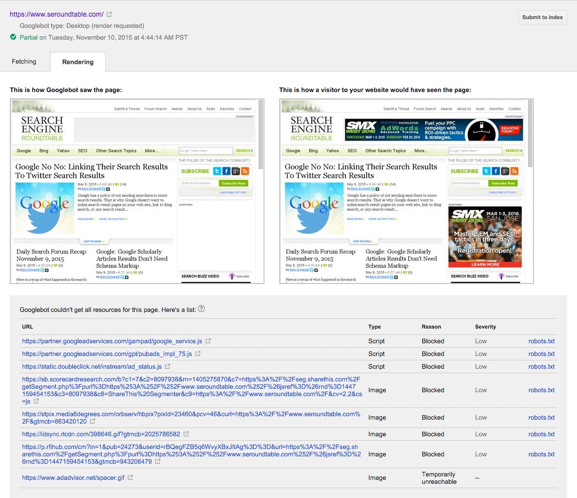 The following image shows an example of two blocked sources from a site: