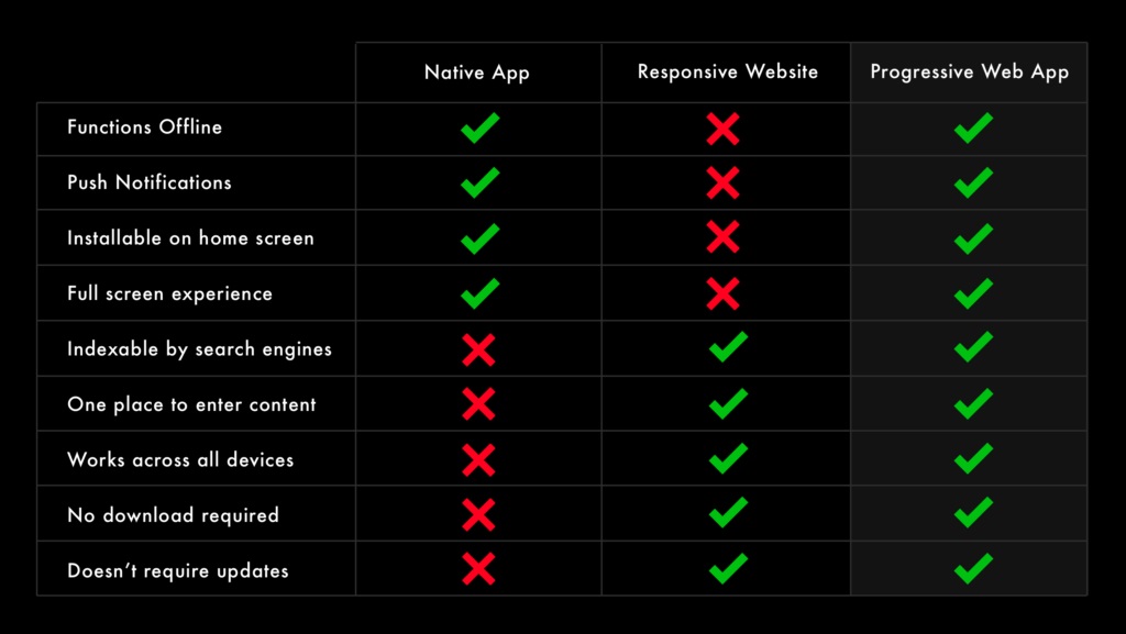 d) Cross Application Login Support: Native apps can talk to other apps and authenticate logins (Facebook, Twitter, Google). As a webpage, PWA can’t communicate with other apps installed.