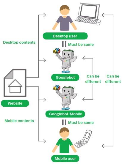 So keep in mind that the content type for both Google Desktop and Google Mobile Robots should be the same, and the only differences you are allowed to make are the page layouts. Also, note that the page content and format should be completely identical for the mobile user and the Google mobile robot. The same content and format should be in place for desktop users and Google desktop robots.