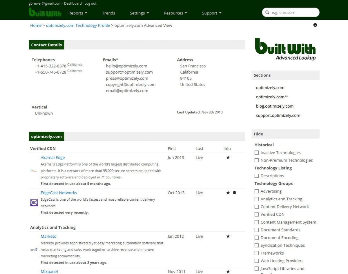 This tool can display technologies used on a website. These technologies include webserver display, content management, hosting information, IP sharing or proprietary, email service, security and statistic certification, and the JavaScript libraries used on the site.