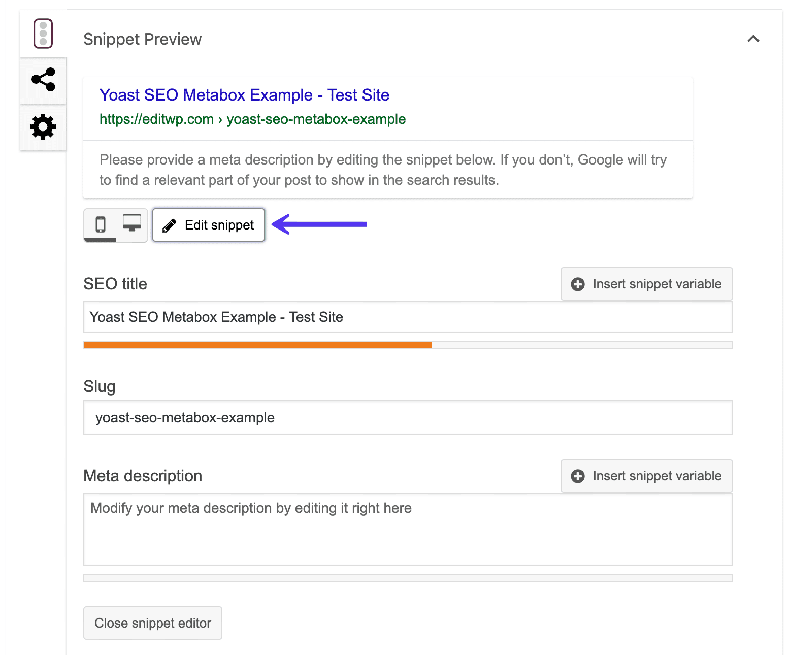 Vous pouvez modifier manuellement le titre de la page et la méta-description en cliquant sur l’option Modifier l’extrait de code . En même temps, vous verrez un aperçu de la façon dont la page est affichée dans les résultats des moteurs de recherche.