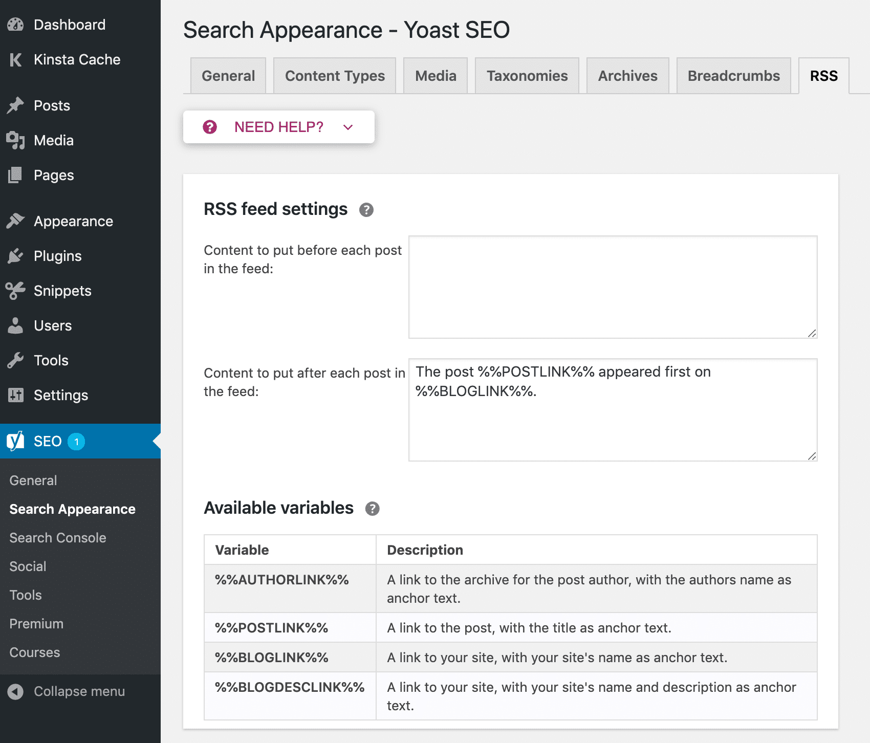 Cet onglet vous permet d’ajouter du contenu supplémentaire au flux RSS avant ou après le contenu d’origine de la publication. Vous pouvez également utiliser les variables pour insérer automatiquement des informations dans cette section.